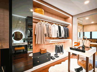 Task lighting is important for accurate color matching and efficient dressing; LED lights inside the wardrobe or under shelves are a great way to do this. Accent lighting draws attention to certain elements, like accessories, and looks stunning. Ambient lighting sets the mood and provides sufficient lighting.